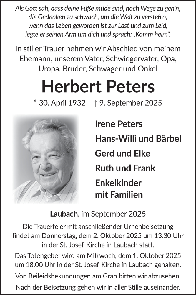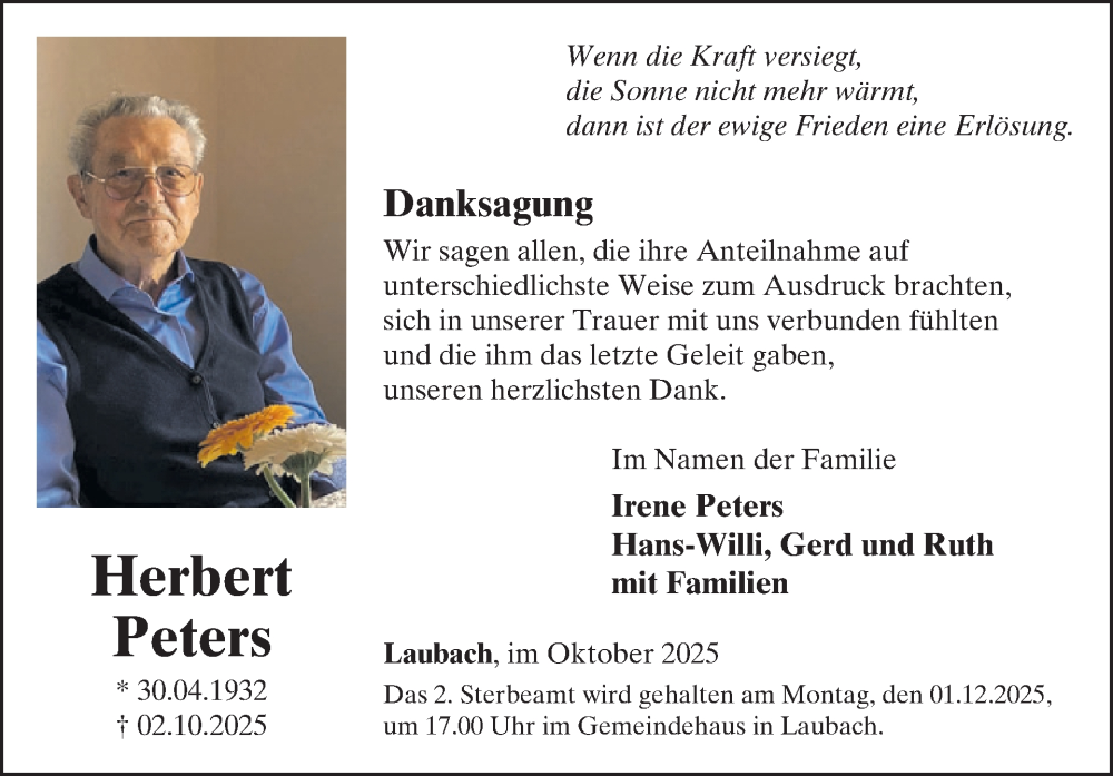 Hier finden Sie alle Traueranzeigen aus der Zeitung, die bisher für Herbert Peters erschienen sind. Weitere Traueranzeigen, die in der Zeitung erscheinen, werden hier ebenfalls aufgelistet