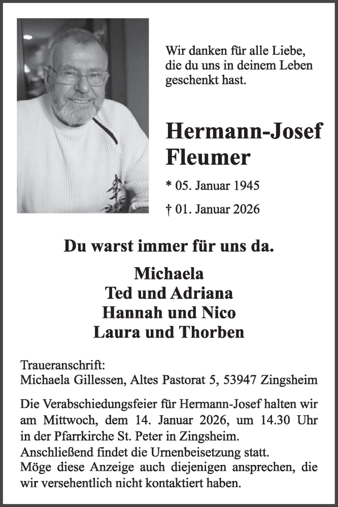 Hier finden Sie alle Traueranzeigen aus der Zeitung, die bisher für Hermann-Josef Fleumer erschienen sind. Weitere Traueranzeigen, die in der Zeitung erscheinen, werden hier ebenfalls aufgelistet