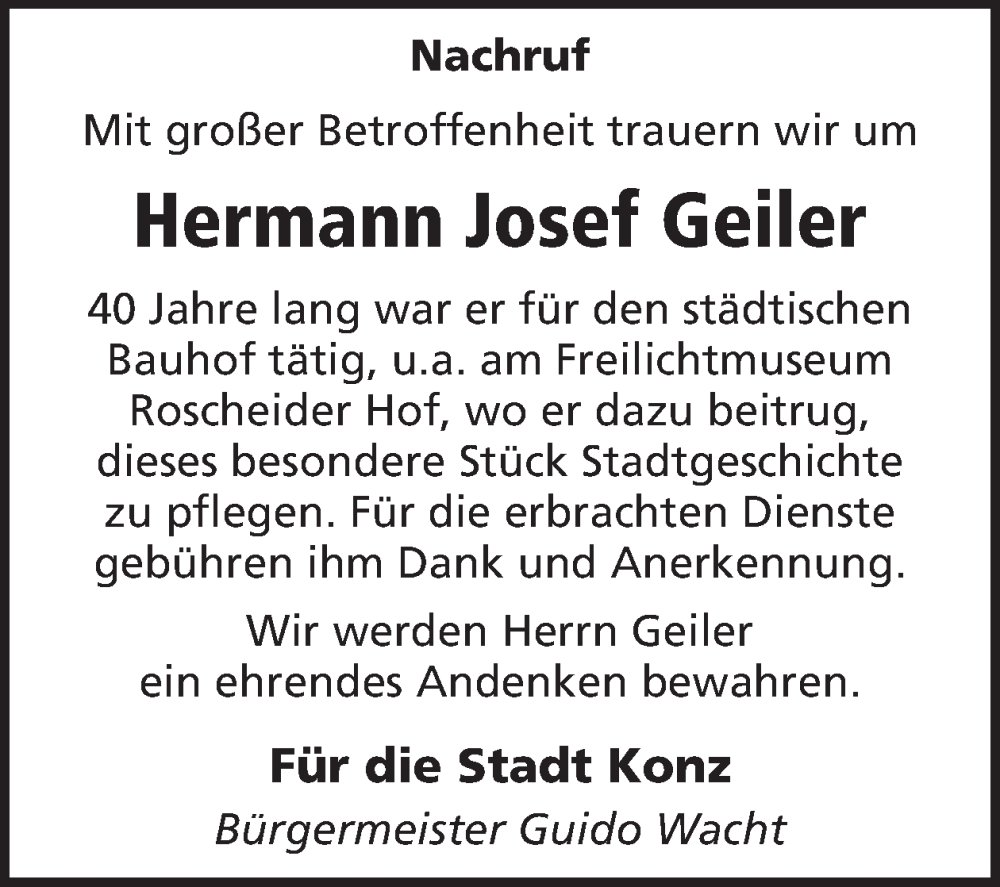 Hier finden Sie alle Traueranzeigen aus der Zeitung, die bisher für Hermann Josef Geiler erschienen sind. Weitere Traueranzeigen, die in der Zeitung erscheinen, werden hier ebenfalls aufgelistet