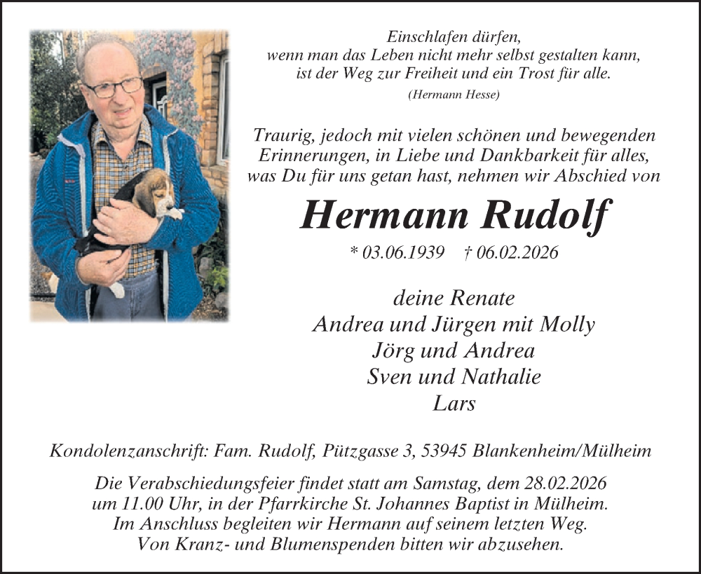 Hier finden Sie alle Traueranzeigen aus der Zeitung, die bisher für Hermann Rudolf erschienen sind. Weitere Traueranzeigen, die in der Zeitung erscheinen, werden hier ebenfalls aufgelistet