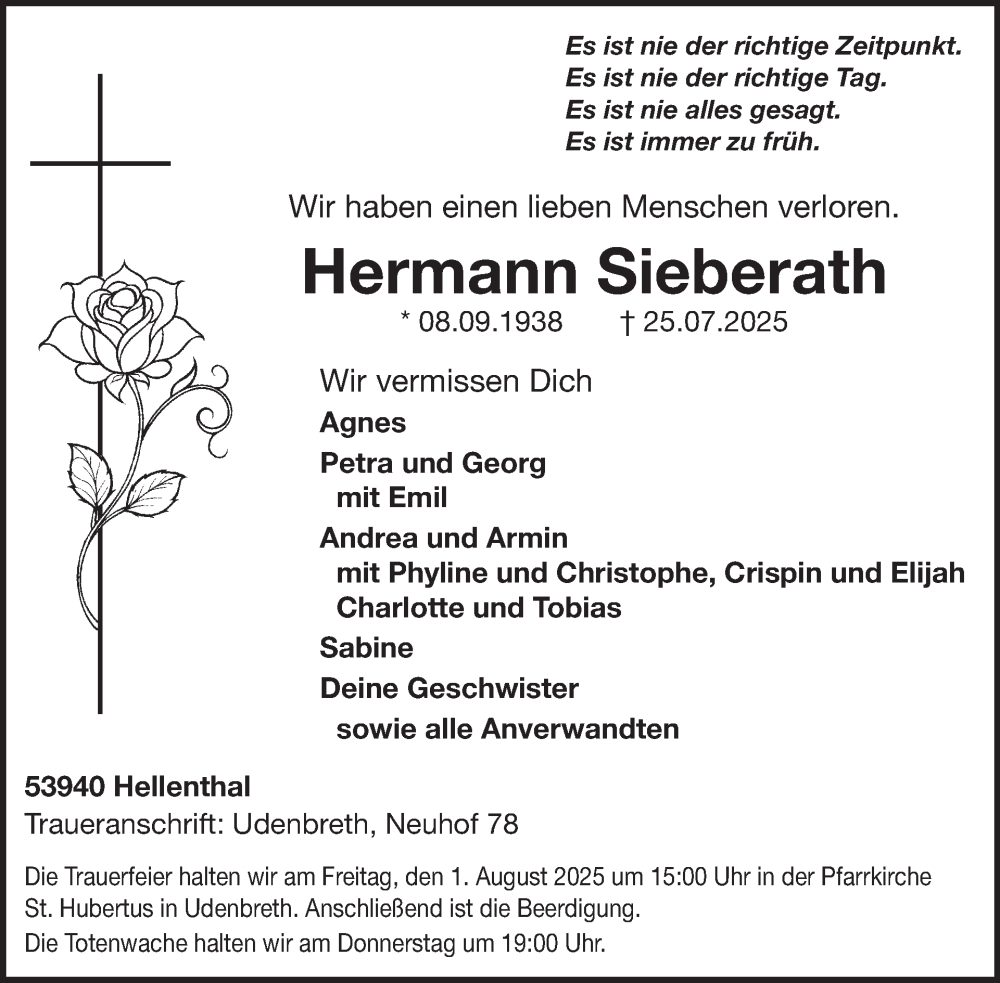 Hier finden Sie alle Traueranzeigen aus der Zeitung, die bisher für Hermann Sieberath erschienen sind. Weitere Traueranzeigen, die in der Zeitung erscheinen, werden hier ebenfalls aufgelistet