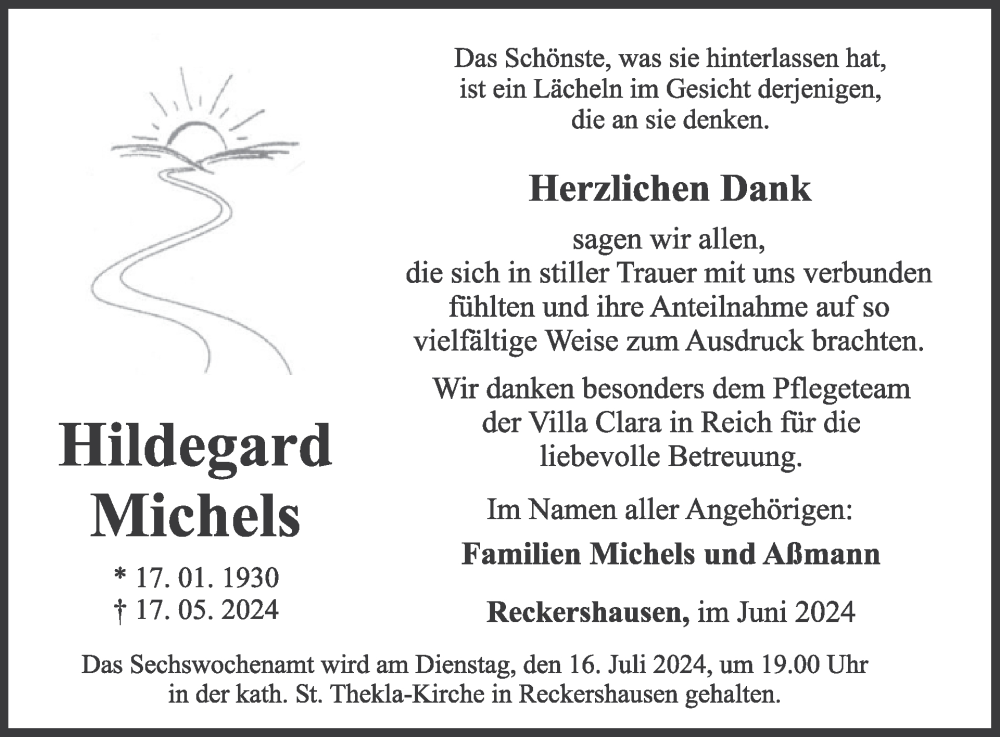 Hier finden Sie alle Traueranzeigen aus der Zeitung, die bisher für Hildegard Michels erschienen sind. Weitere Traueranzeigen, die in der Zeitung erscheinen, werden hier ebenfalls aufgelistet