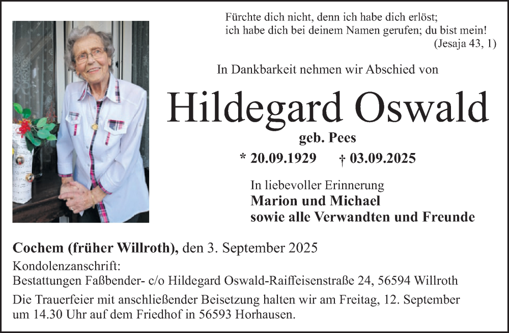 Hier finden Sie alle Traueranzeigen aus der Zeitung, die bisher für Hildegard Oswald erschienen sind. Weitere Traueranzeigen, die in der Zeitung erscheinen, werden hier ebenfalls aufgelistet