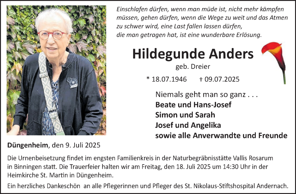 Hier finden Sie alle Traueranzeigen aus der Zeitung, die bisher für Hildegunde Anders erschienen sind. Weitere Traueranzeigen, die in der Zeitung erscheinen, werden hier ebenfalls aufgelistet