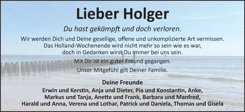 Hier finden Sie alle Traueranzeigen aus der Zeitung, die bisher für Holger erschienen sind. Weitere Traueranzeigen, die in der Zeitung erscheinen, werden hier ebenfalls aufgelistet