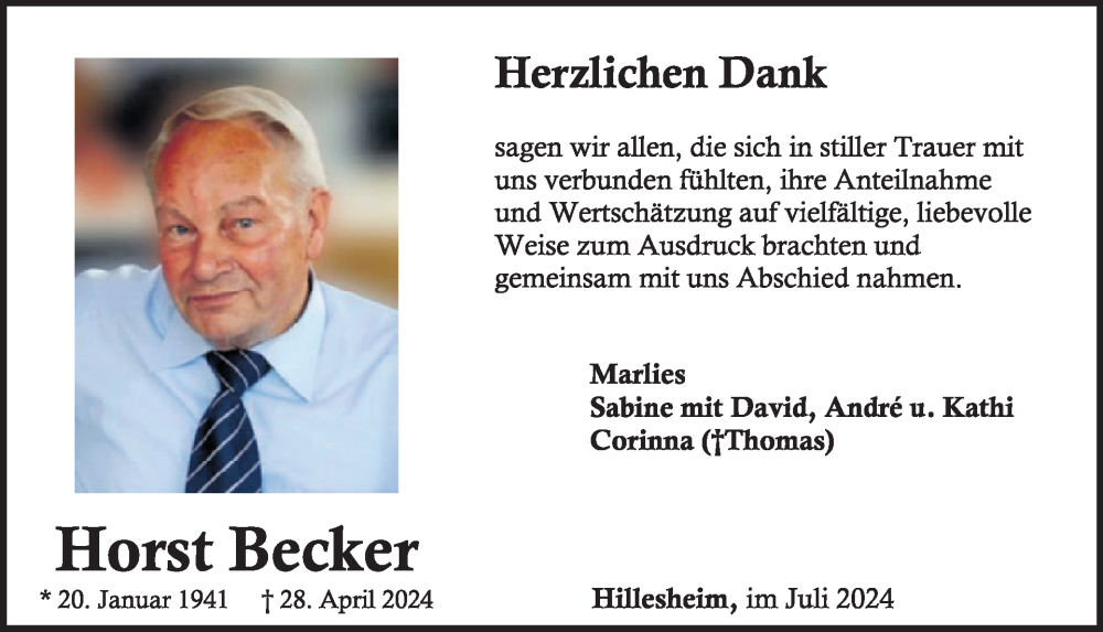 Hier finden Sie alle Traueranzeigen aus der Zeitung, die bisher für Horst Becker erschienen sind. Weitere Traueranzeigen, die in der Zeitung erscheinen, werden hier ebenfalls aufgelistet