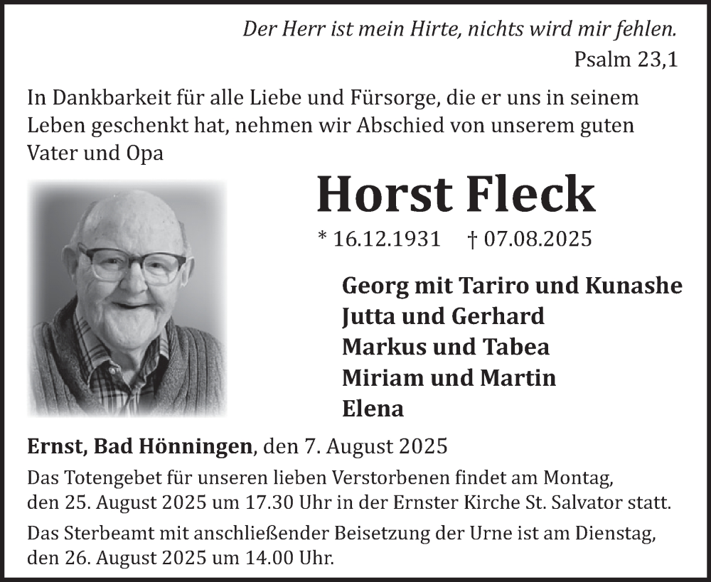 Hier finden Sie alle Traueranzeigen aus der Zeitung, die bisher für Horst Fleck erschienen sind. Weitere Traueranzeigen, die in der Zeitung erscheinen, werden hier ebenfalls aufgelistet