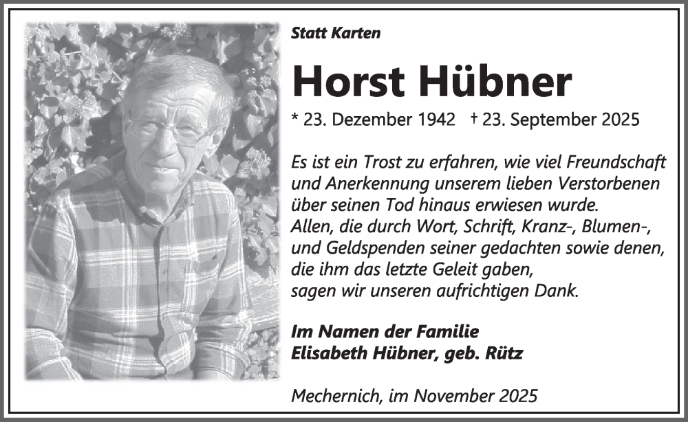 Hier finden Sie alle Traueranzeigen aus der Zeitung, die bisher für Horst Hübner erschienen sind. Weitere Traueranzeigen, die in der Zeitung erscheinen, werden hier ebenfalls aufgelistet