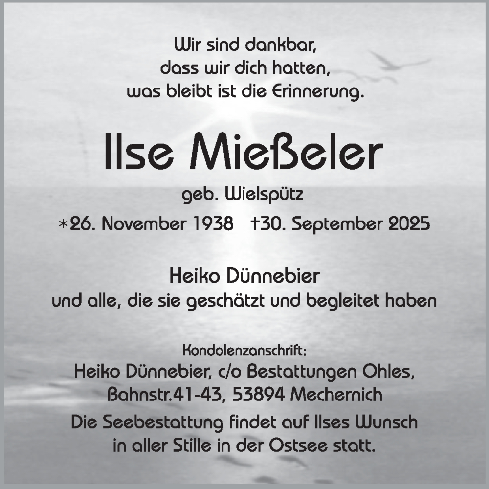 Hier finden Sie alle Traueranzeigen aus der Zeitung, die bisher für Ilse Mießeler erschienen sind. Weitere Traueranzeigen, die in der Zeitung erscheinen, werden hier ebenfalls aufgelistet