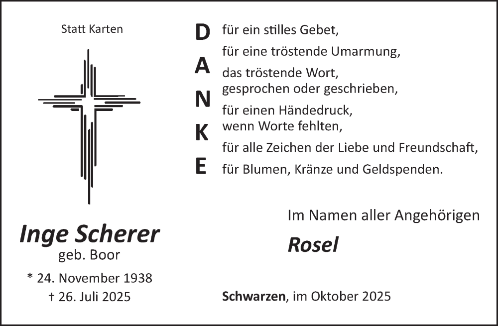 Hier finden Sie alle Traueranzeigen aus der Zeitung, die bisher für Inge Scherer erschienen sind. Weitere Traueranzeigen, die in der Zeitung erscheinen, werden hier ebenfalls aufgelistet