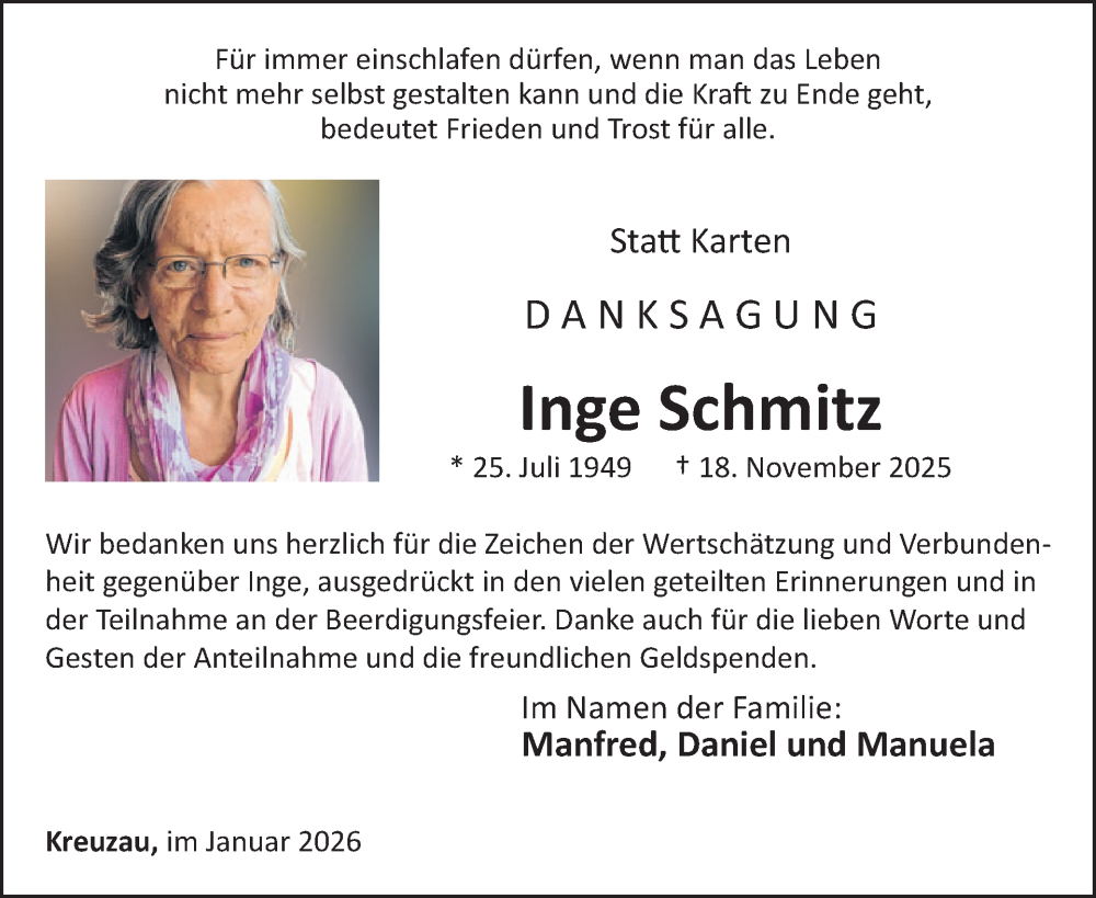 Hier finden Sie alle Traueranzeigen aus der Zeitung, die bisher für Inge Schmitz erschienen sind. Weitere Traueranzeigen, die in der Zeitung erscheinen, werden hier ebenfalls aufgelistet