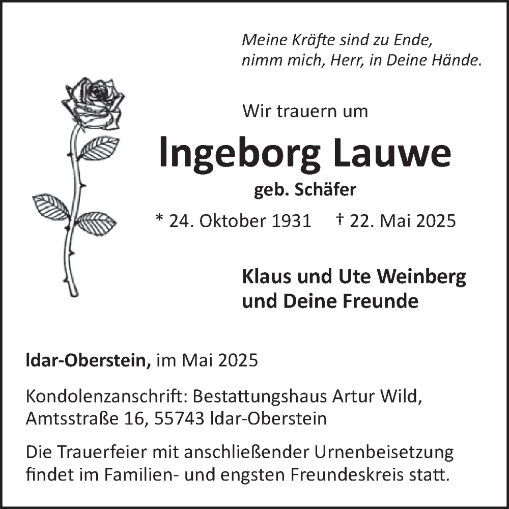 Hier finden Sie alle Traueranzeigen aus der Zeitung, die bisher für Ingeborg Lauwe erschienen sind. Weitere Traueranzeigen, die in der Zeitung erscheinen, werden hier ebenfalls aufgelistet