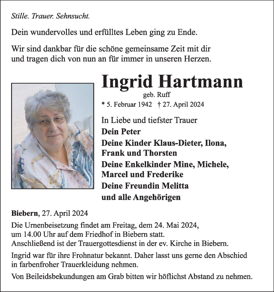 Hier finden Sie alle Traueranzeigen aus der Zeitung, die bisher für Ingrid Hartmann erschienen sind. Weitere Traueranzeigen, die in der Zeitung erscheinen, werden hier ebenfalls aufgelistet