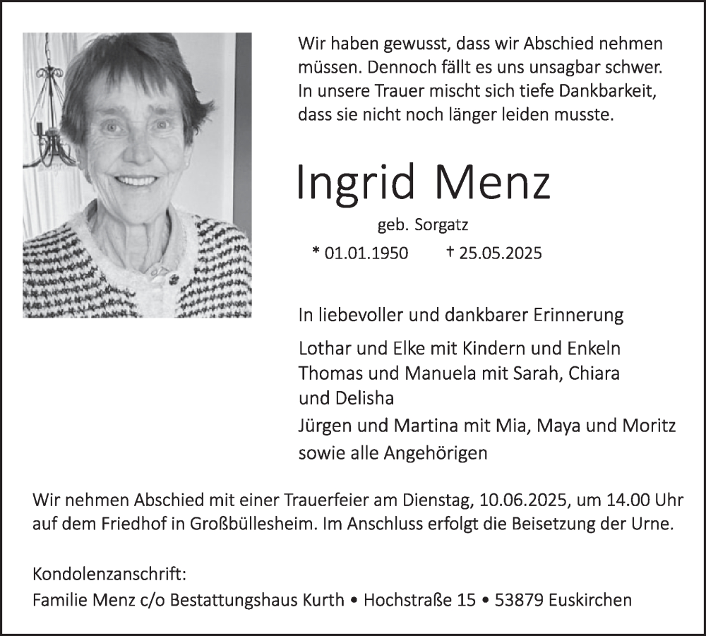 Hier finden Sie alle Traueranzeigen aus der Zeitung, die bisher für Ingrid Menz erschienen sind. Weitere Traueranzeigen, die in der Zeitung erscheinen, werden hier ebenfalls aufgelistet