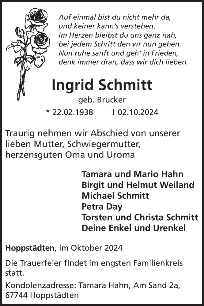 Hier finden Sie alle Traueranzeigen aus der Zeitung, die bisher für Ingrid Schmitt erschienen sind. Weitere Traueranzeigen, die in der Zeitung erscheinen, werden hier ebenfalls aufgelistet