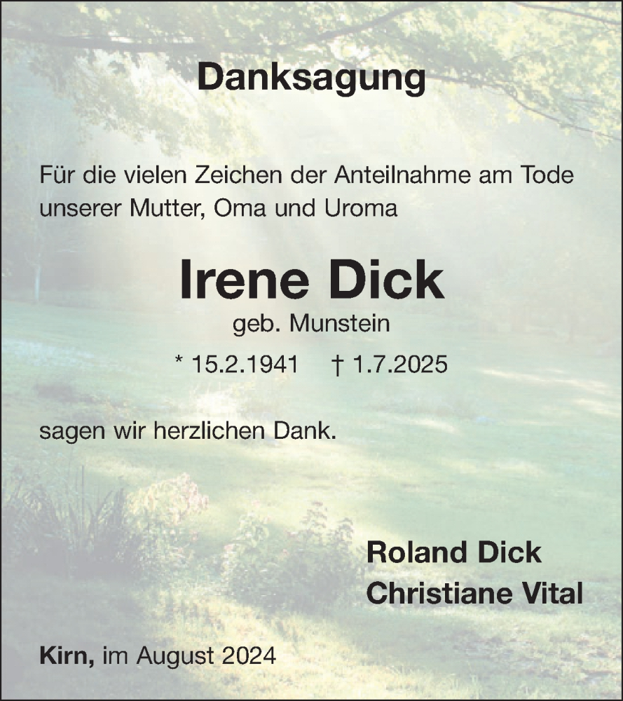 Hier finden Sie alle Traueranzeigen aus der Zeitung, die bisher für Irene Dick erschienen sind. Weitere Traueranzeigen, die in der Zeitung erscheinen, werden hier ebenfalls aufgelistet