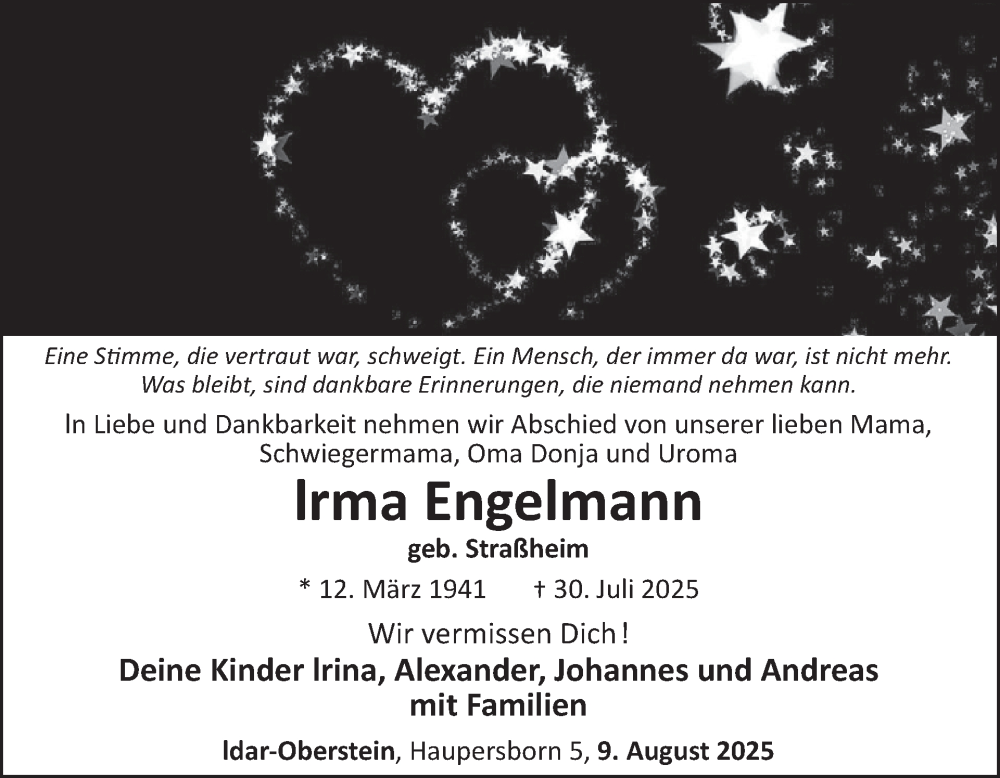 Hier finden Sie alle Traueranzeigen aus der Zeitung, die bisher für Irma Engelmann erschienen sind. Weitere Traueranzeigen, die in der Zeitung erscheinen, werden hier ebenfalls aufgelistet