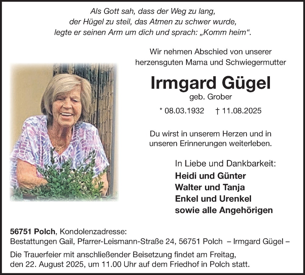 Hier finden Sie alle Traueranzeigen aus der Zeitung, die bisher für Irmgard Gügel erschienen sind. Weitere Traueranzeigen, die in der Zeitung erscheinen, werden hier ebenfalls aufgelistet