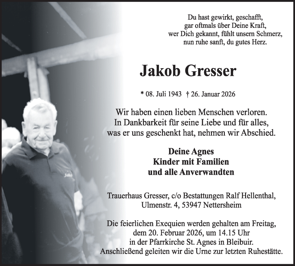 Hier finden Sie alle Traueranzeigen aus der Zeitung, die bisher für Jakob Gresser erschienen sind. Weitere Traueranzeigen, die in der Zeitung erscheinen, werden hier ebenfalls aufgelistet
