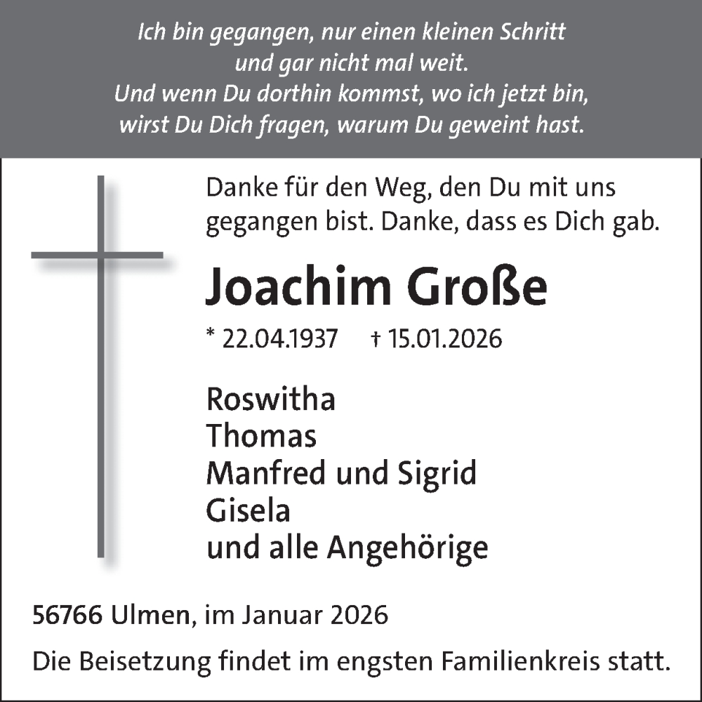 Hier finden Sie alle Traueranzeigen aus der Zeitung, die bisher für Joachim Große erschienen sind. Weitere Traueranzeigen, die in der Zeitung erscheinen, werden hier ebenfalls aufgelistet