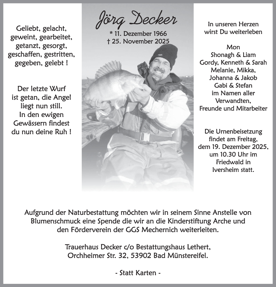 Hier finden Sie alle Traueranzeigen aus der Zeitung, die bisher für Jörg Decker erschienen sind. Weitere Traueranzeigen, die in der Zeitung erscheinen, werden hier ebenfalls aufgelistet