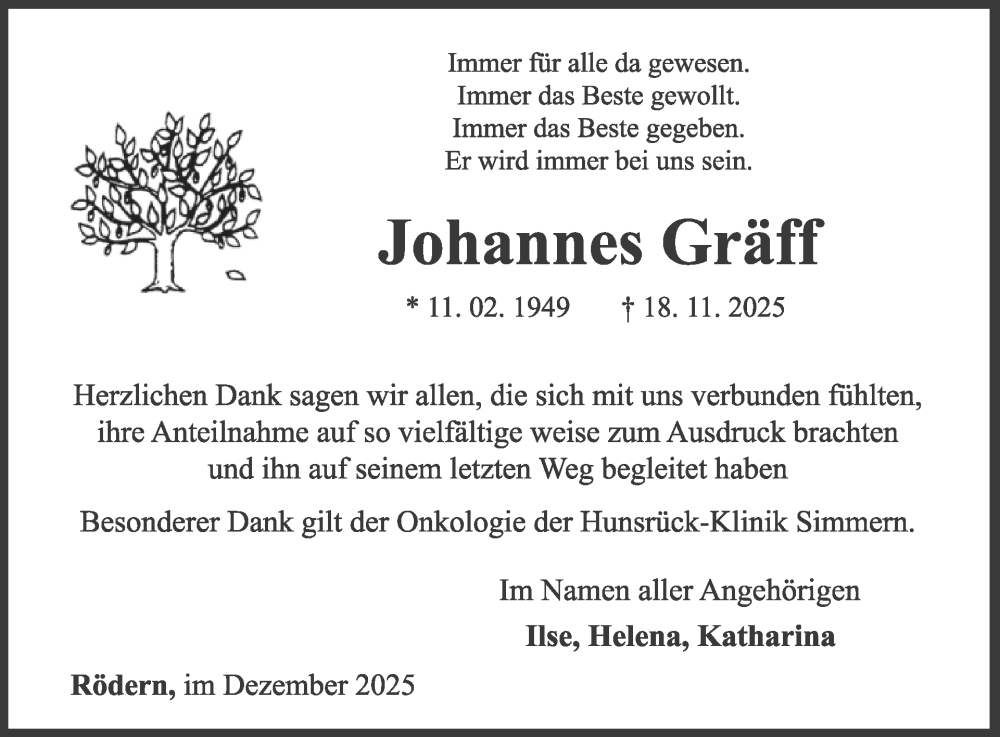 Hier finden Sie alle Traueranzeigen aus der Zeitung, die bisher für Johannes Gräff erschienen sind. Weitere Traueranzeigen, die in der Zeitung erscheinen, werden hier ebenfalls aufgelistet