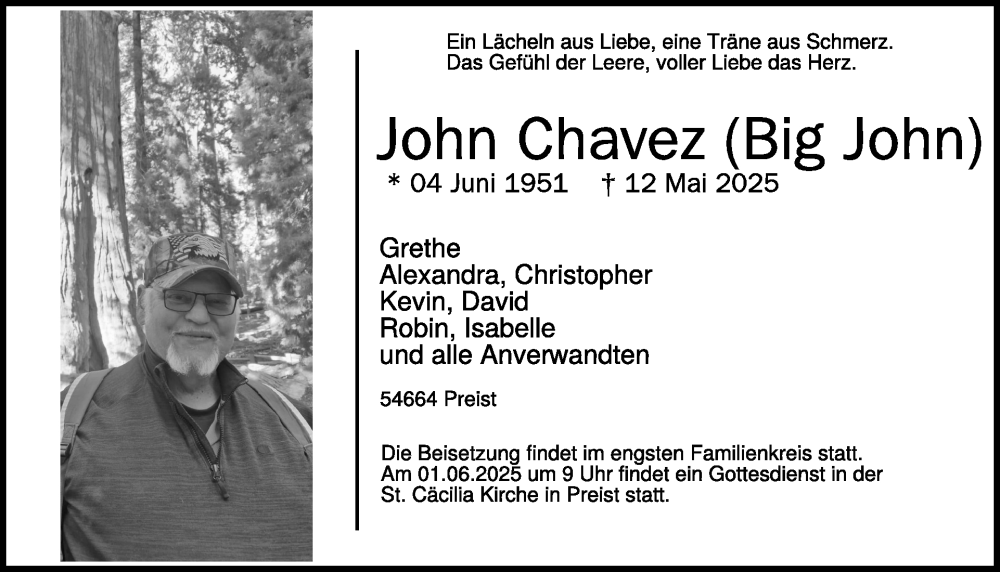 Hier finden Sie alle Traueranzeigen aus der Zeitung, die bisher für John Chavez erschienen sind. Weitere Traueranzeigen, die in der Zeitung erscheinen, werden hier ebenfalls aufgelistet
