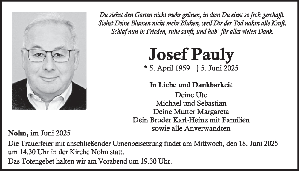 Hier finden Sie alle Traueranzeigen aus der Zeitung, die bisher für Josef Pauly erschienen sind. Weitere Traueranzeigen, die in der Zeitung erscheinen, werden hier ebenfalls aufgelistet