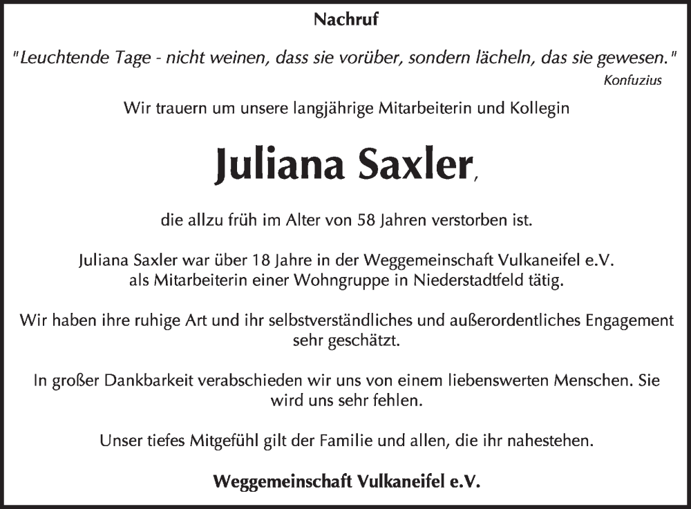 Hier finden Sie alle Traueranzeigen aus der Zeitung, die bisher für Juliana Saxler erschienen sind. Weitere Traueranzeigen, die in der Zeitung erscheinen, werden hier ebenfalls aufgelistet