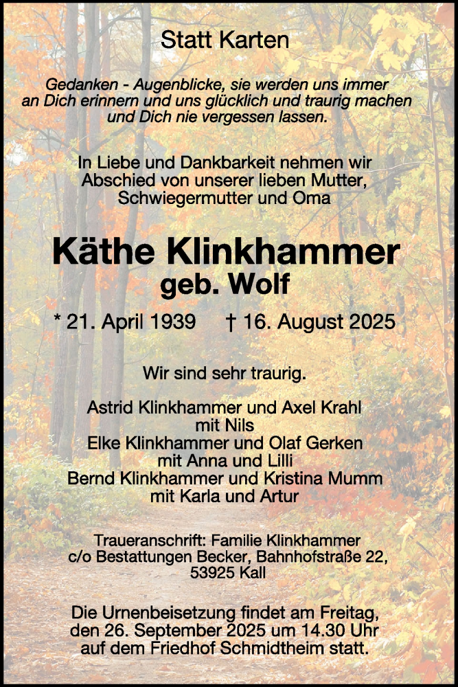 Hier finden Sie alle Traueranzeigen aus der Zeitung, die bisher für Käthe Klinkhammer erschienen sind. Weitere Traueranzeigen, die in der Zeitung erscheinen, werden hier ebenfalls aufgelistet