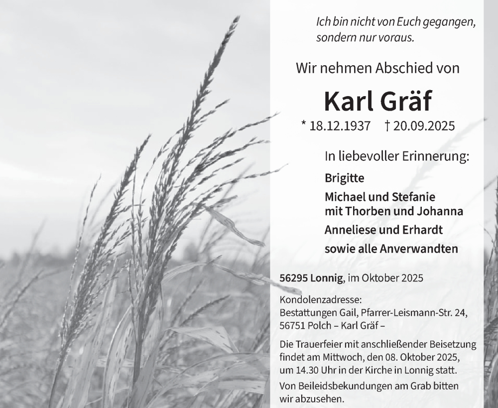 Hier finden Sie alle Traueranzeigen aus der Zeitung, die bisher für Karl Gräf erschienen sind. Weitere Traueranzeigen, die in der Zeitung erscheinen, werden hier ebenfalls aufgelistet