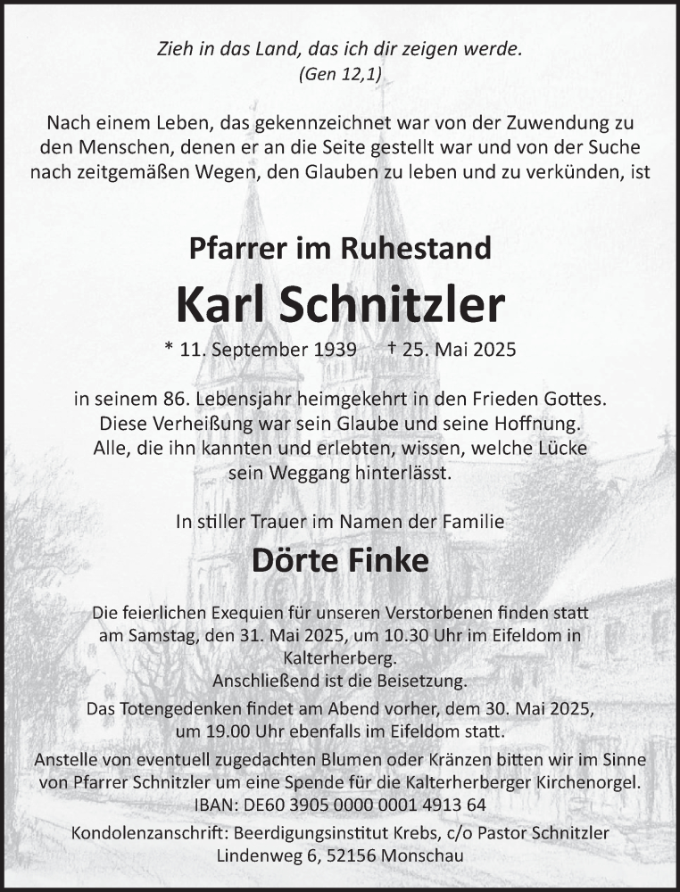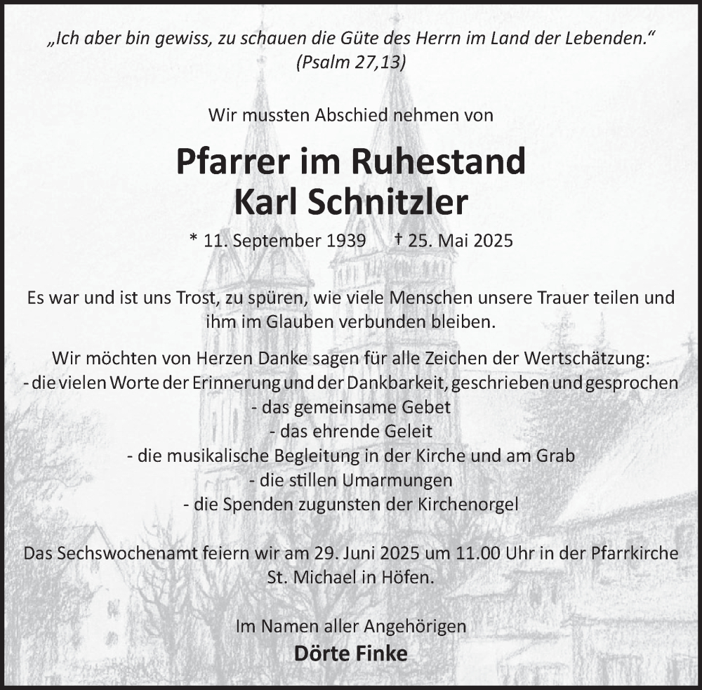 Hier finden Sie alle Traueranzeigen aus der Zeitung, die bisher für Karl Schnitzler erschienen sind. Weitere Traueranzeigen, die in der Zeitung erscheinen, werden hier ebenfalls aufgelistet