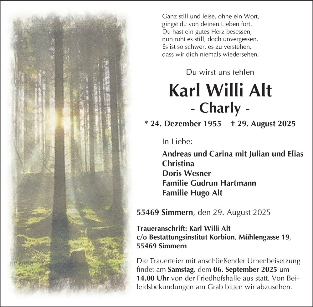 Hier finden Sie alle Traueranzeigen aus der Zeitung, die bisher für Karl Willi Alt erschienen sind. Weitere Traueranzeigen, die in der Zeitung erscheinen, werden hier ebenfalls aufgelistet