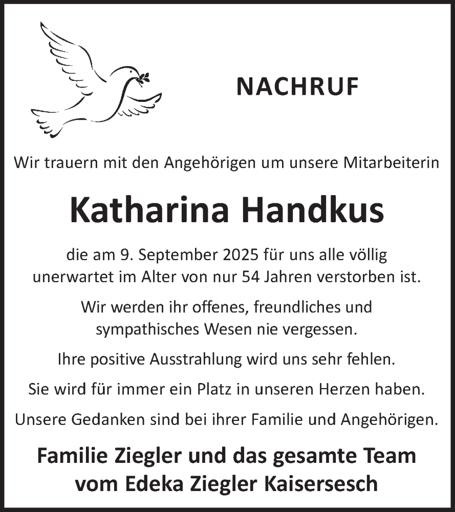 Hier finden Sie alle Traueranzeigen aus der Zeitung, die bisher für Katharina Handkus erschienen sind. Weitere Traueranzeigen, die in der Zeitung erscheinen, werden hier ebenfalls aufgelistet