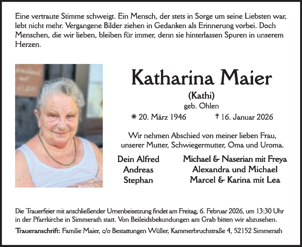 Hier finden Sie alle Traueranzeigen aus der Zeitung, die bisher für Katharina Maier erschienen sind. Weitere Traueranzeigen, die in der Zeitung erscheinen, werden hier ebenfalls aufgelistet
