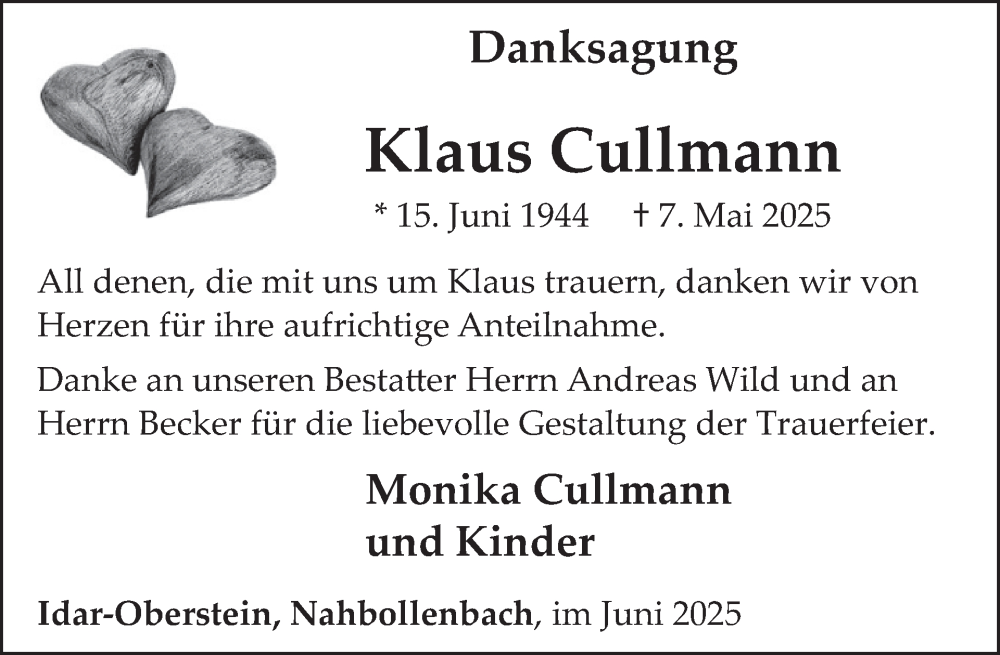 Hier finden Sie alle Traueranzeigen aus der Zeitung, die bisher für Klaus Cullmann erschienen sind. Weitere Traueranzeigen, die in der Zeitung erscheinen, werden hier ebenfalls aufgelistet