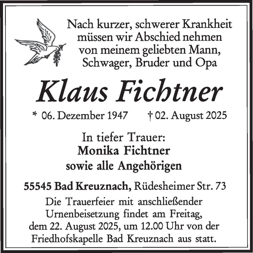 Hier finden Sie alle Traueranzeigen aus der Zeitung, die bisher für Klaus Fichtner erschienen sind. Weitere Traueranzeigen, die in der Zeitung erscheinen, werden hier ebenfalls aufgelistet