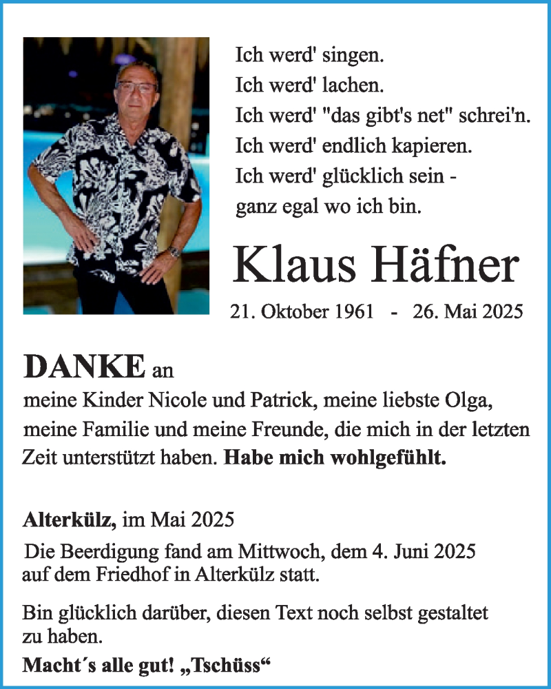 Hier finden Sie alle Traueranzeigen aus der Zeitung, die bisher für Klaus Häfner erschienen sind. Weitere Traueranzeigen, die in der Zeitung erscheinen, werden hier ebenfalls aufgelistet