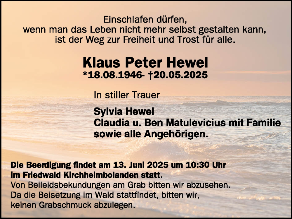 Hier finden Sie alle Traueranzeigen aus der Zeitung, die bisher für Klaus Peter Hewel erschienen sind. Weitere Traueranzeigen, die in der Zeitung erscheinen, werden hier ebenfalls aufgelistet