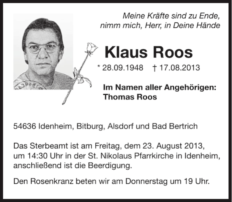 Hier finden Sie alle Traueranzeigen aus der Zeitung, die bisher für Klaus Roos erschienen sind. Weitere Traueranzeigen, die in der Zeitung erscheinen, werden hier ebenfalls aufgelistet