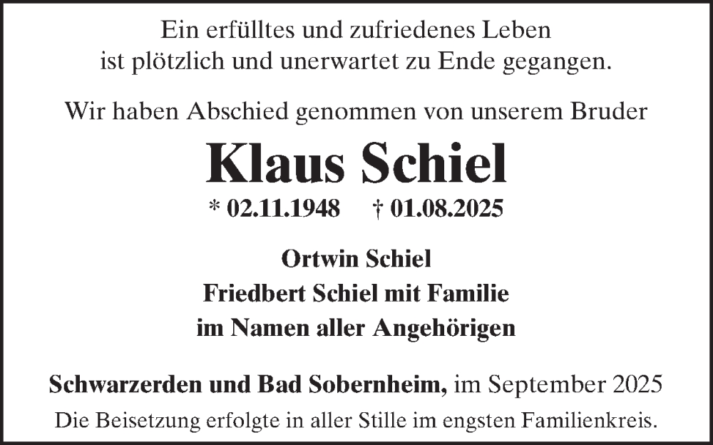 Hier finden Sie alle Traueranzeigen aus der Zeitung, die bisher für Klaus Schiel erschienen sind. Weitere Traueranzeigen, die in der Zeitung erscheinen, werden hier ebenfalls aufgelistet
