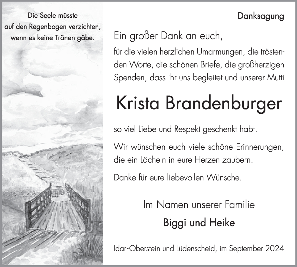 Hier finden Sie alle Traueranzeigen aus der Zeitung, die bisher für Krista Brandenburger erschienen sind. Weitere Traueranzeigen, die in der Zeitung erscheinen, werden hier ebenfalls aufgelistet