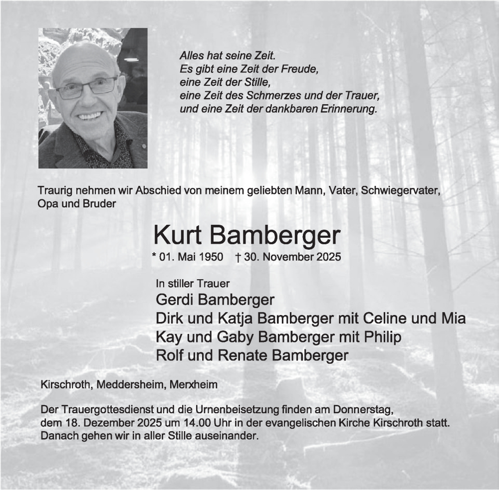 Hier finden Sie alle Traueranzeigen aus der Zeitung, die bisher für Kurt Bamberger erschienen sind. Weitere Traueranzeigen, die in der Zeitung erscheinen, werden hier ebenfalls aufgelistet