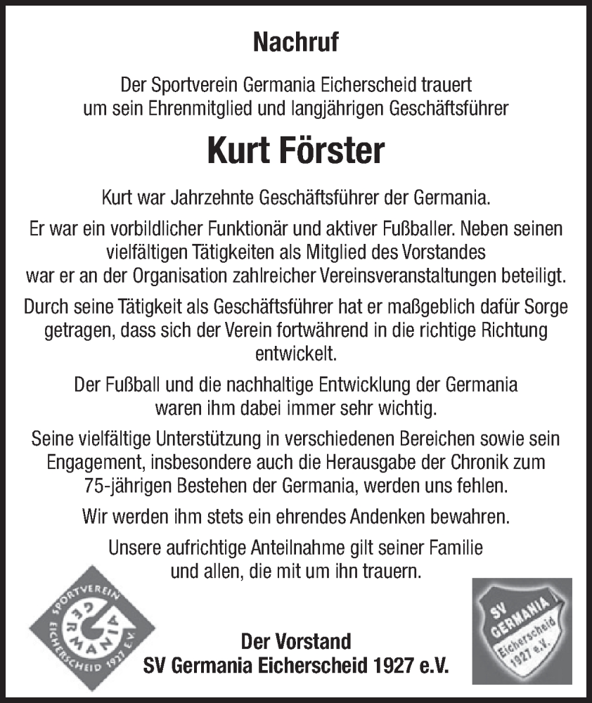 Hier finden Sie alle Traueranzeigen aus der Zeitung, die bisher für Kurt Förster erschienen sind. Weitere Traueranzeigen, die in der Zeitung erscheinen, werden hier ebenfalls aufgelistet