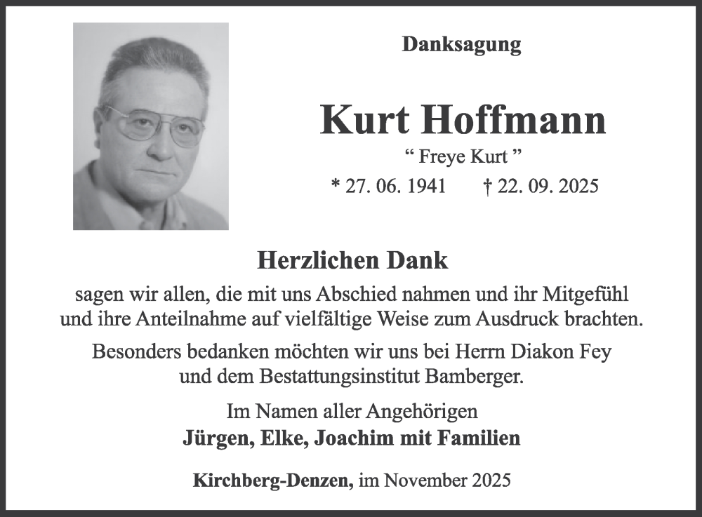 Hier finden Sie alle Traueranzeigen aus der Zeitung, die bisher für Kurt Hoffmann erschienen sind. Weitere Traueranzeigen, die in der Zeitung erscheinen, werden hier ebenfalls aufgelistet