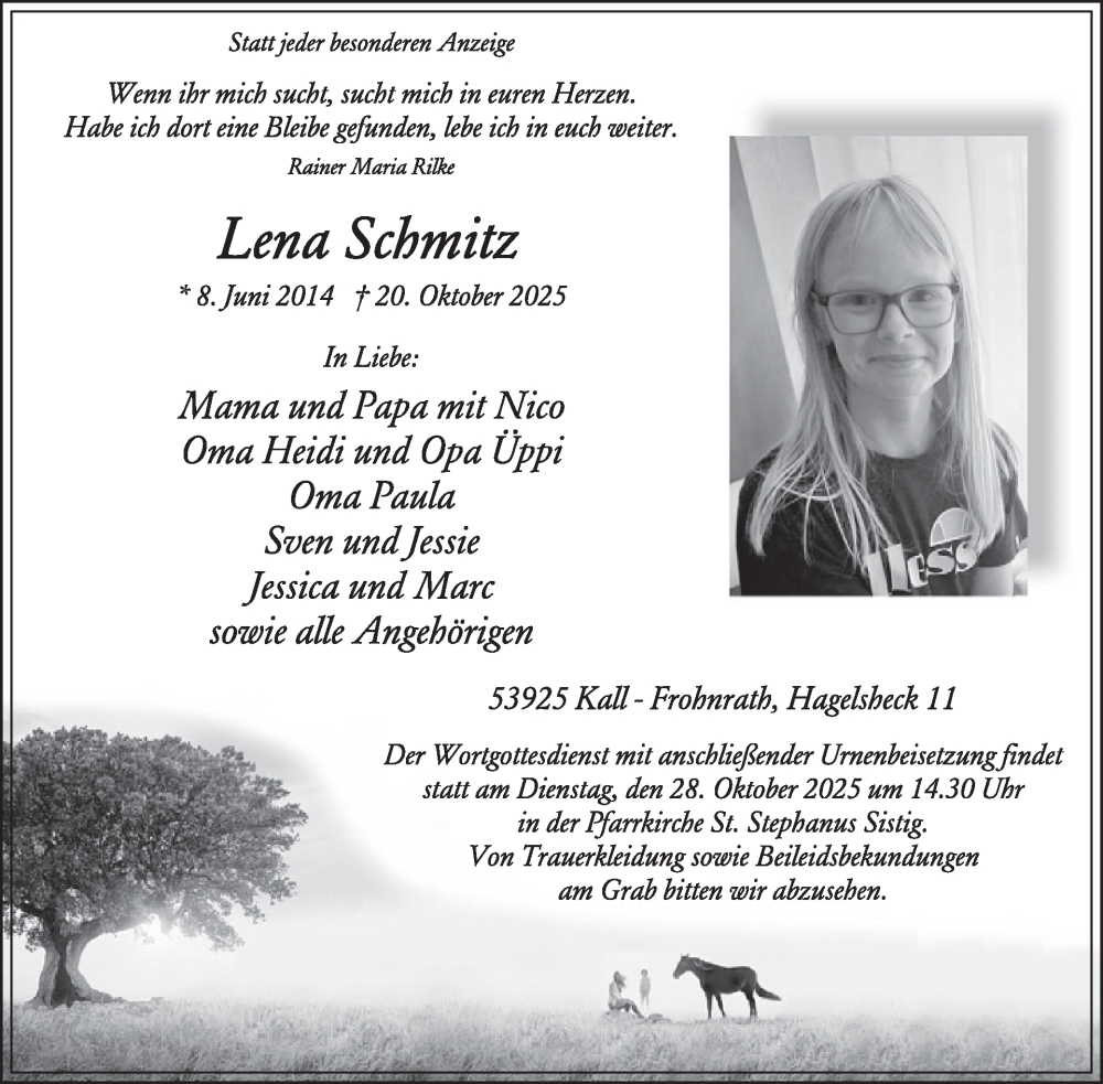 Hier finden Sie alle Traueranzeigen aus der Zeitung, die bisher für Lena Schmitz erschienen sind. Weitere Traueranzeigen, die in der Zeitung erscheinen, werden hier ebenfalls aufgelistet