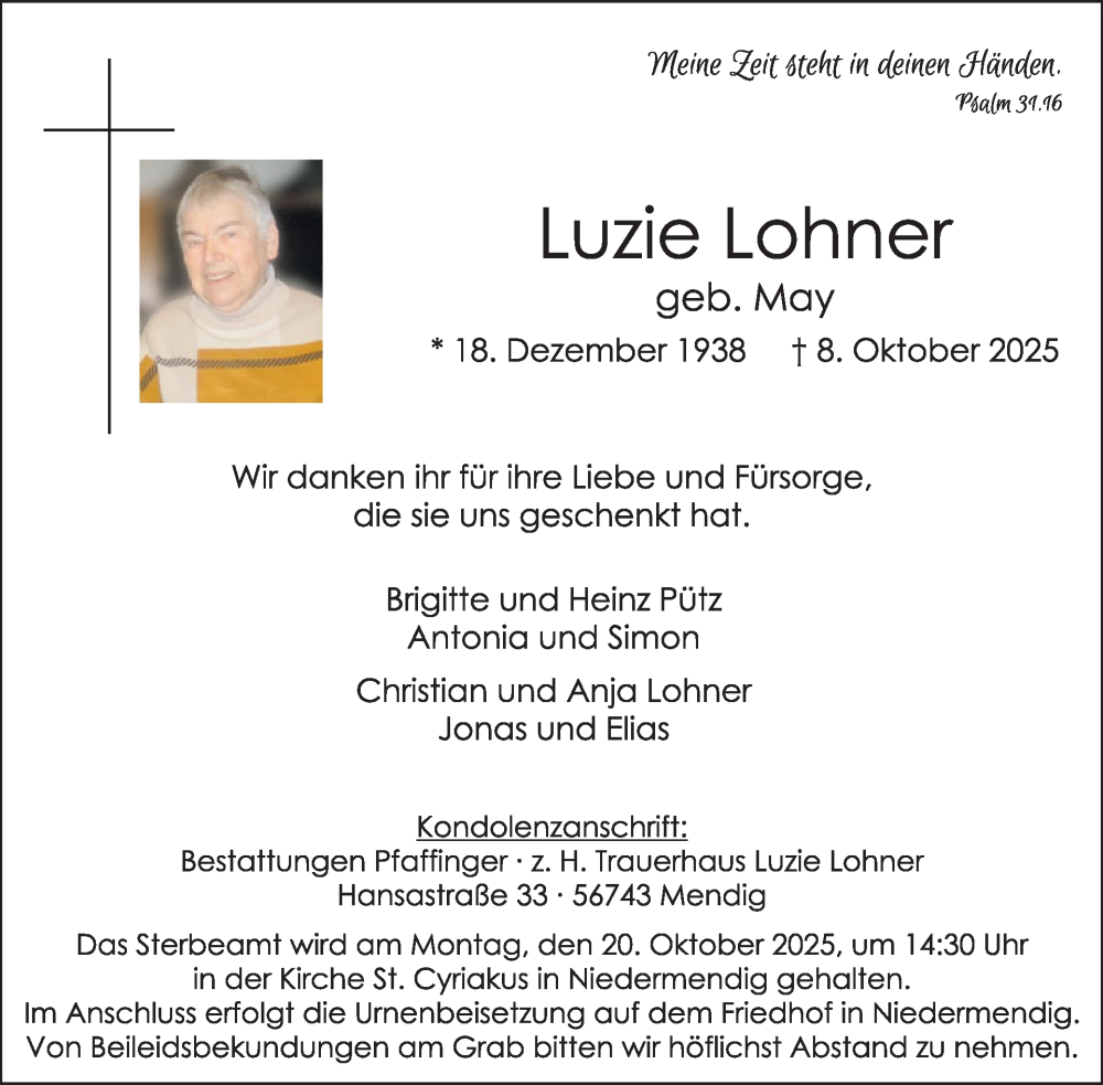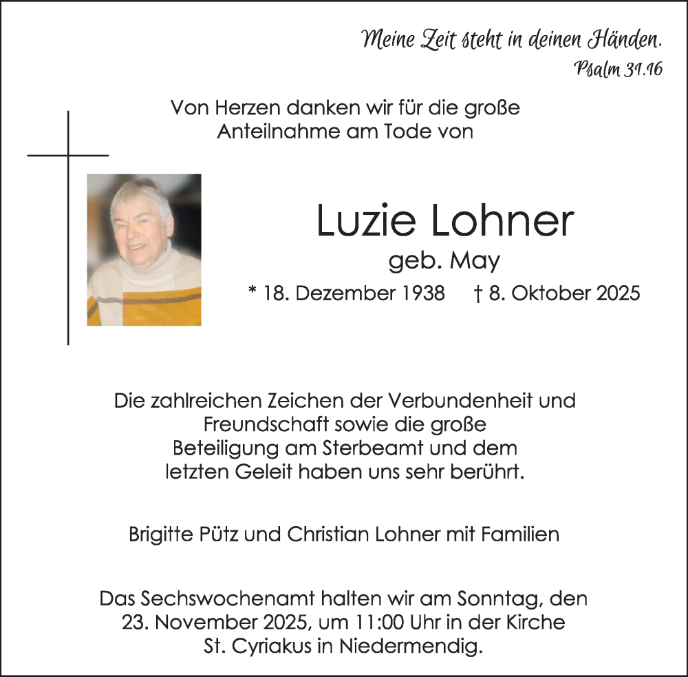 Hier finden Sie alle Traueranzeigen aus der Zeitung, die bisher für Luzie Lohner erschienen sind. Weitere Traueranzeigen, die in der Zeitung erscheinen, werden hier ebenfalls aufgelistet