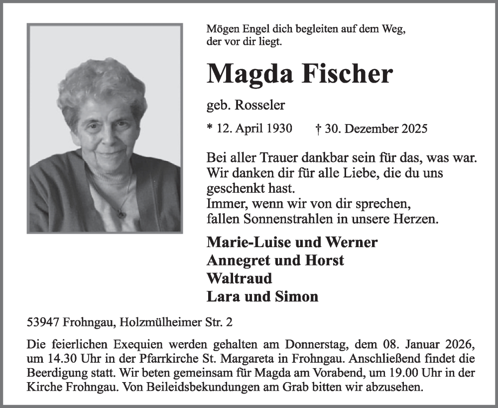 Hier finden Sie alle Traueranzeigen aus der Zeitung, die bisher für Magda Fischer erschienen sind. Weitere Traueranzeigen, die in der Zeitung erscheinen, werden hier ebenfalls aufgelistet