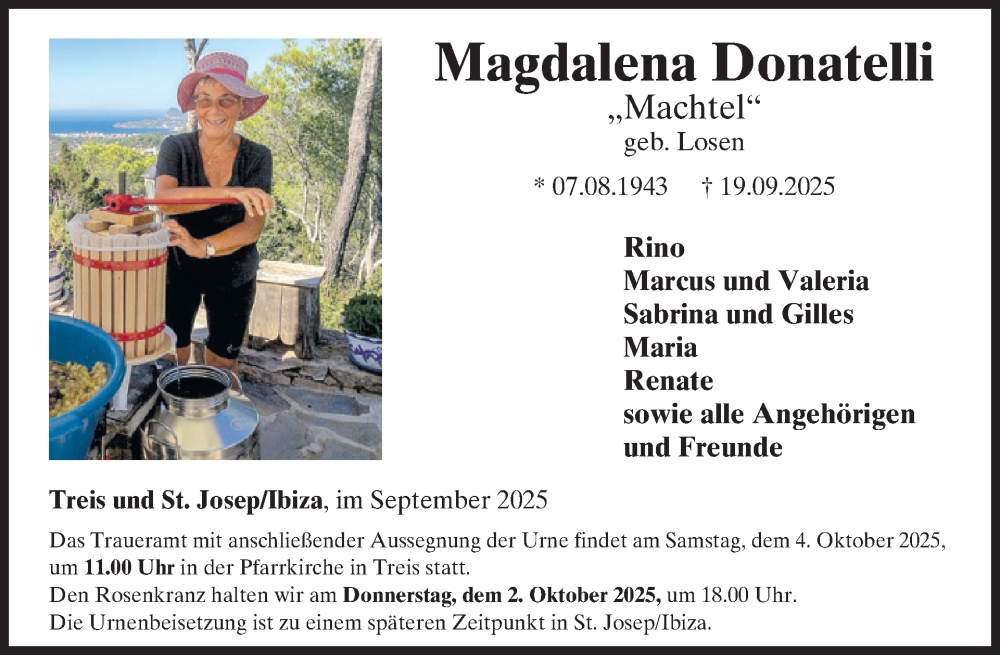 Hier finden Sie alle Traueranzeigen aus der Zeitung, die bisher für Magdalena Donatelli erschienen sind. Weitere Traueranzeigen, die in der Zeitung erscheinen, werden hier ebenfalls aufgelistet