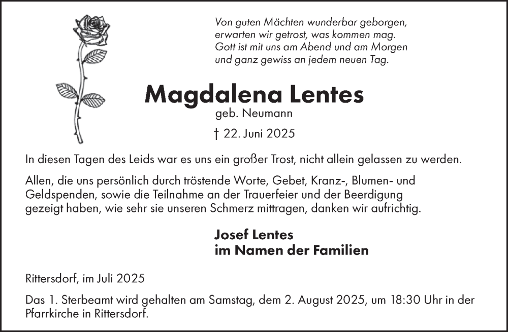 Hier finden Sie alle Traueranzeigen aus der Zeitung, die bisher für Magdalena Lentes erschienen sind. Weitere Traueranzeigen, die in der Zeitung erscheinen, werden hier ebenfalls aufgelistet